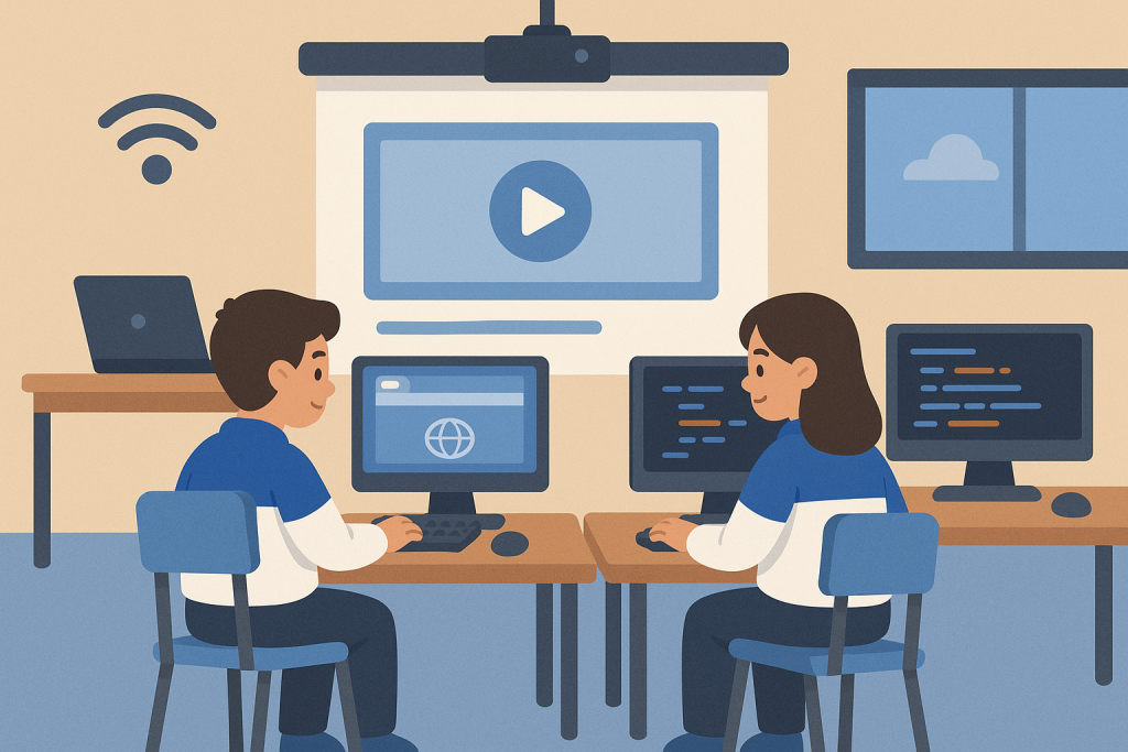 Sala de computación con internet y tecnología en el aula (Proyector, computador y telón).